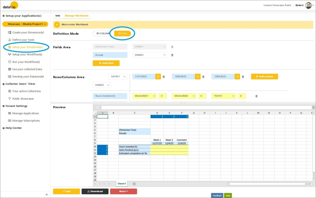 We removed the “Definition Mode” selection from the Workbook Wizard. With the “By Cell Mode” the data from the workbook (= yellow cells) are all written on the one same record.