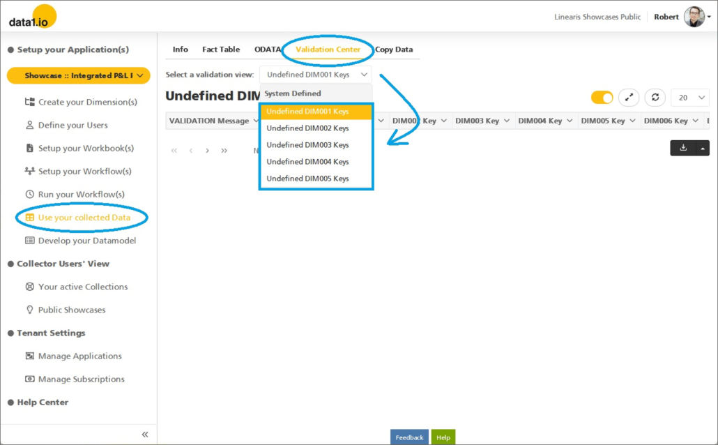 We are very happy that we can deliver the brand new section “Validation Center” with the new validation views. Those views will help you to and identify inconsistencies and keep the data in your datamodel clean. You will find in the dropdown validation views for those dimensions that are activated in your datamodel: