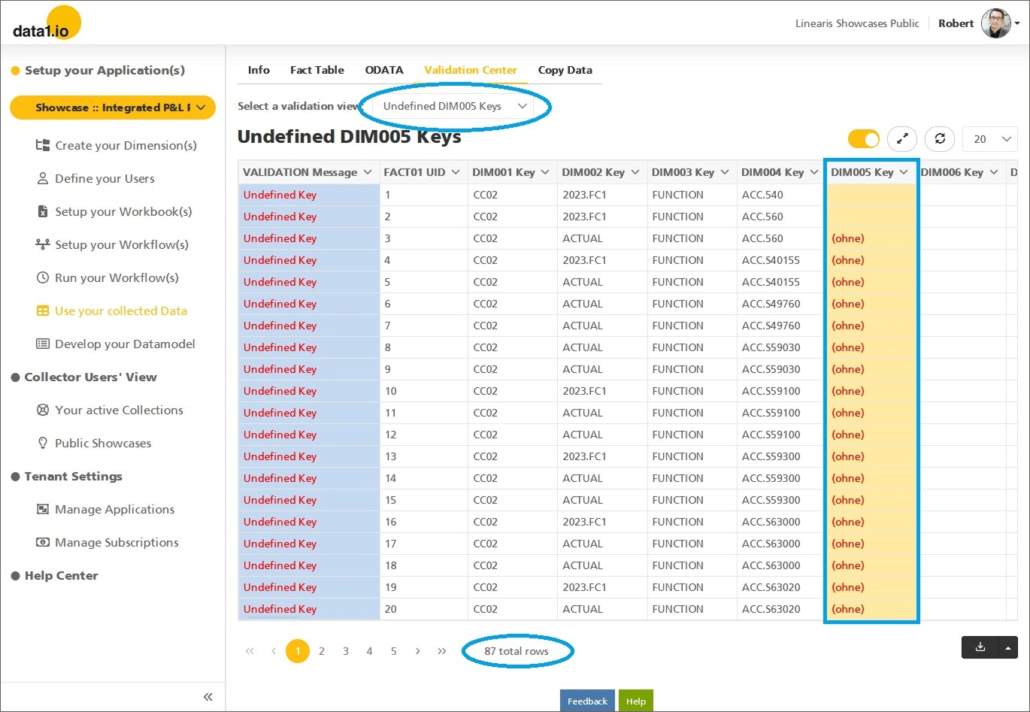 The validation view for DIM005 in this application shows, that 85 fact records use a DIM005 Key which is not defined in the corresponding dimension table and 2 fact records don`t have a DIM005 Key at all.