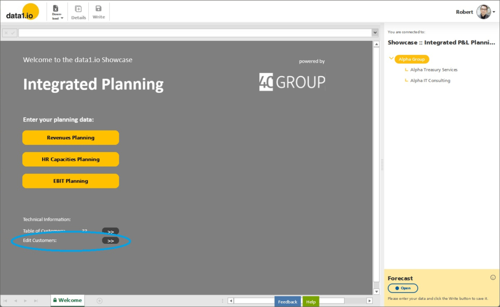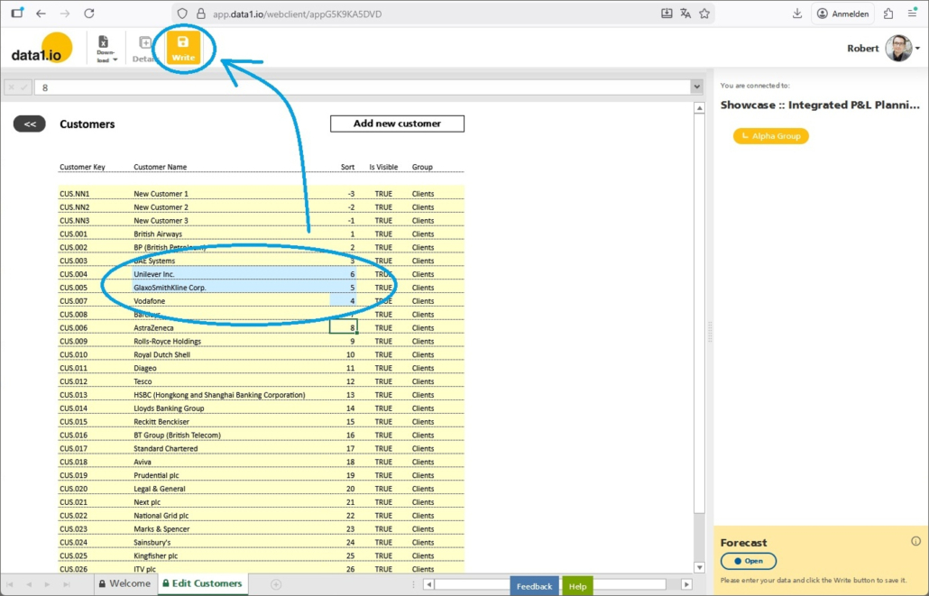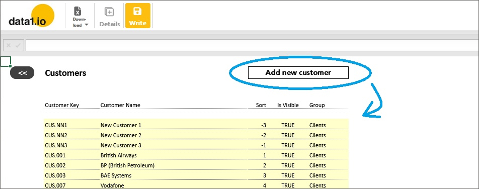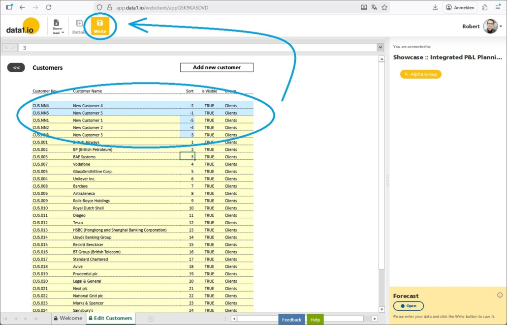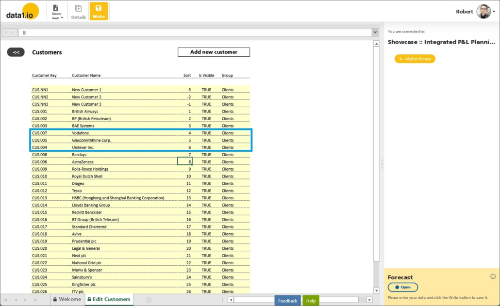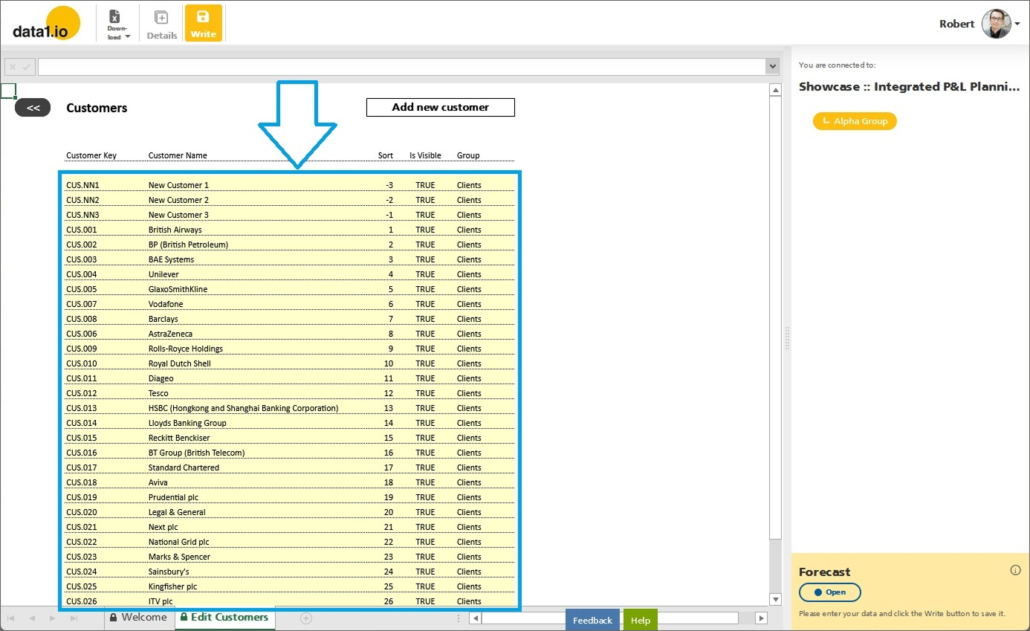 In our P&L Public Showcase have added a new sheet for editing the customer dimension table (which is used as basis for the customer dropdown in the Revenues Planning).