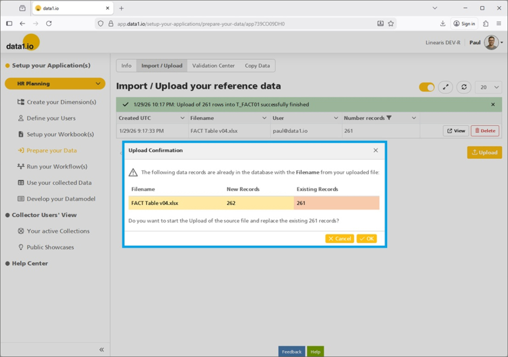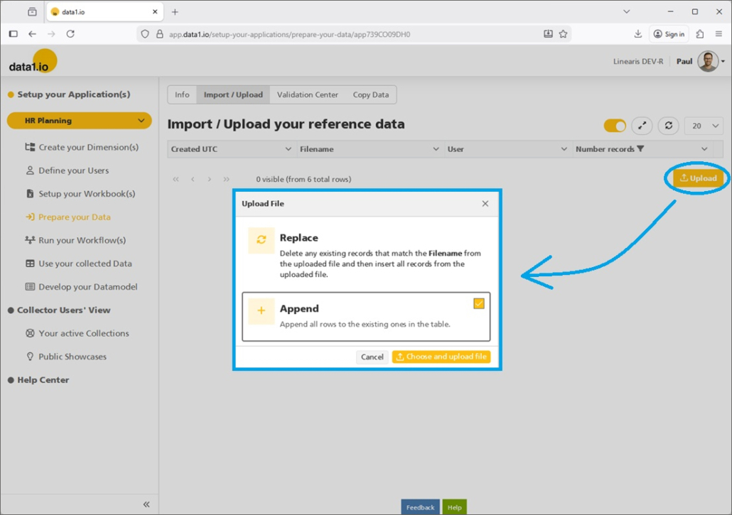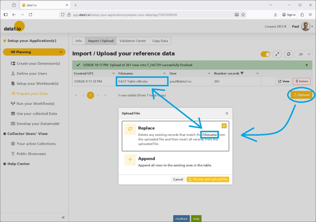 Pressing the “Upload” Button will open the already from the fact table known dialog with the selection Replace or Append mode: